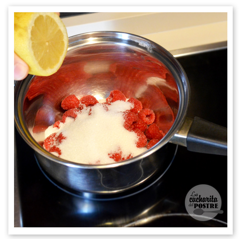 1. Pon a calentar a fuego medio las frambuesas con el azúcar y el zumo de medio limón.