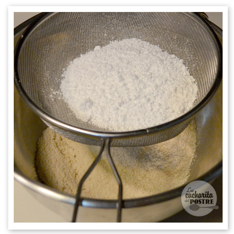 2. Una vez que has tamizado la almendra, le toca el turno al azúcar glasé. En este punto tienes dos opciones: usar un colador limpio (que te facilitará muchísimo la tarea) o fregar el único que tienes (lo digo por mí) y tamizar. Aquí ya la agonía del tamizado es menor y se empieza a ver la luz al final del túnel.