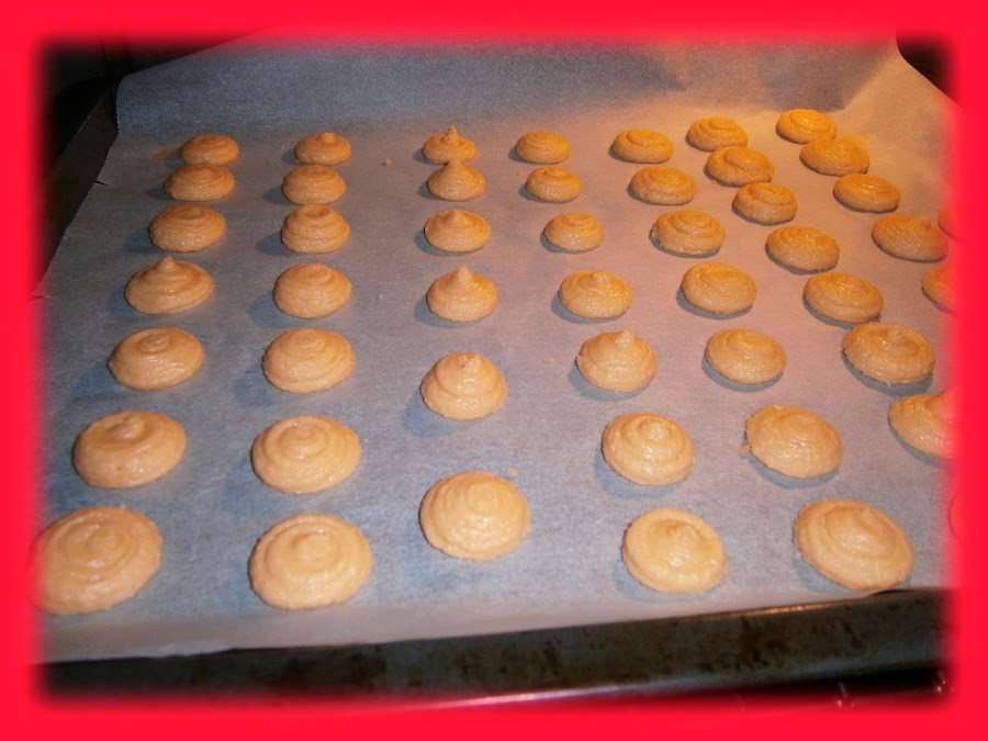 - Con la ayuda de una manga pastelera con una boquilla redonda de 15 mm, la colocamos verticalmente y hacemos presión unos 4 segundos y retiramos, deben quedar de unos 4 cm de diámetro, más o menos.