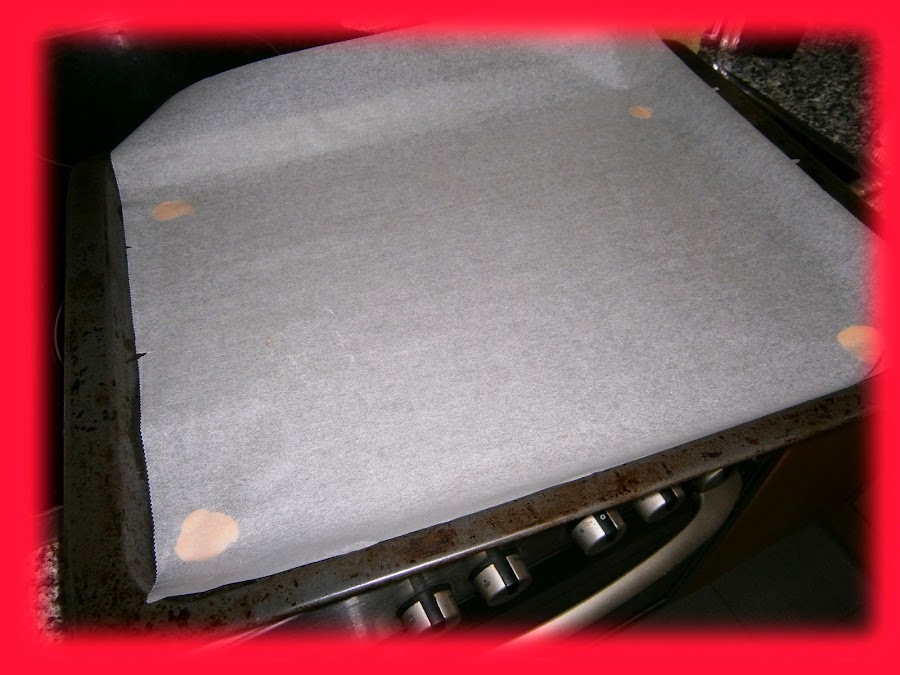 - En la bandeja del horno pegamos con un poquito de masa en cada esquina la hoja de papel de hornear, para que no se mueva.