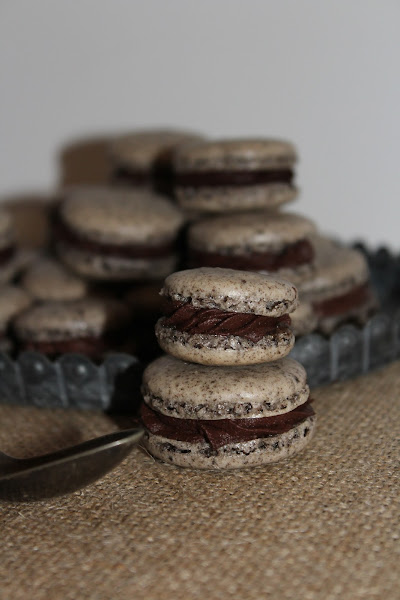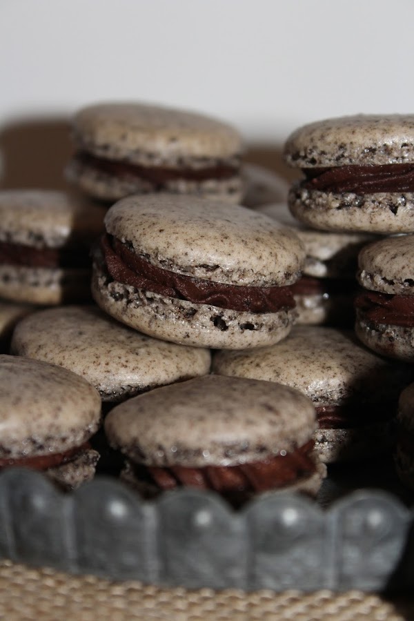 Ahora haremos el relleno. Trituramos las galletas Oreo y las mezclamos con el cacao. Montamos la nata (crema de leche) y le añadimos la mezcla anterior, intercalando con la leche. Enmangamos con una boquilla de estrella. Rellenamos los macarons.