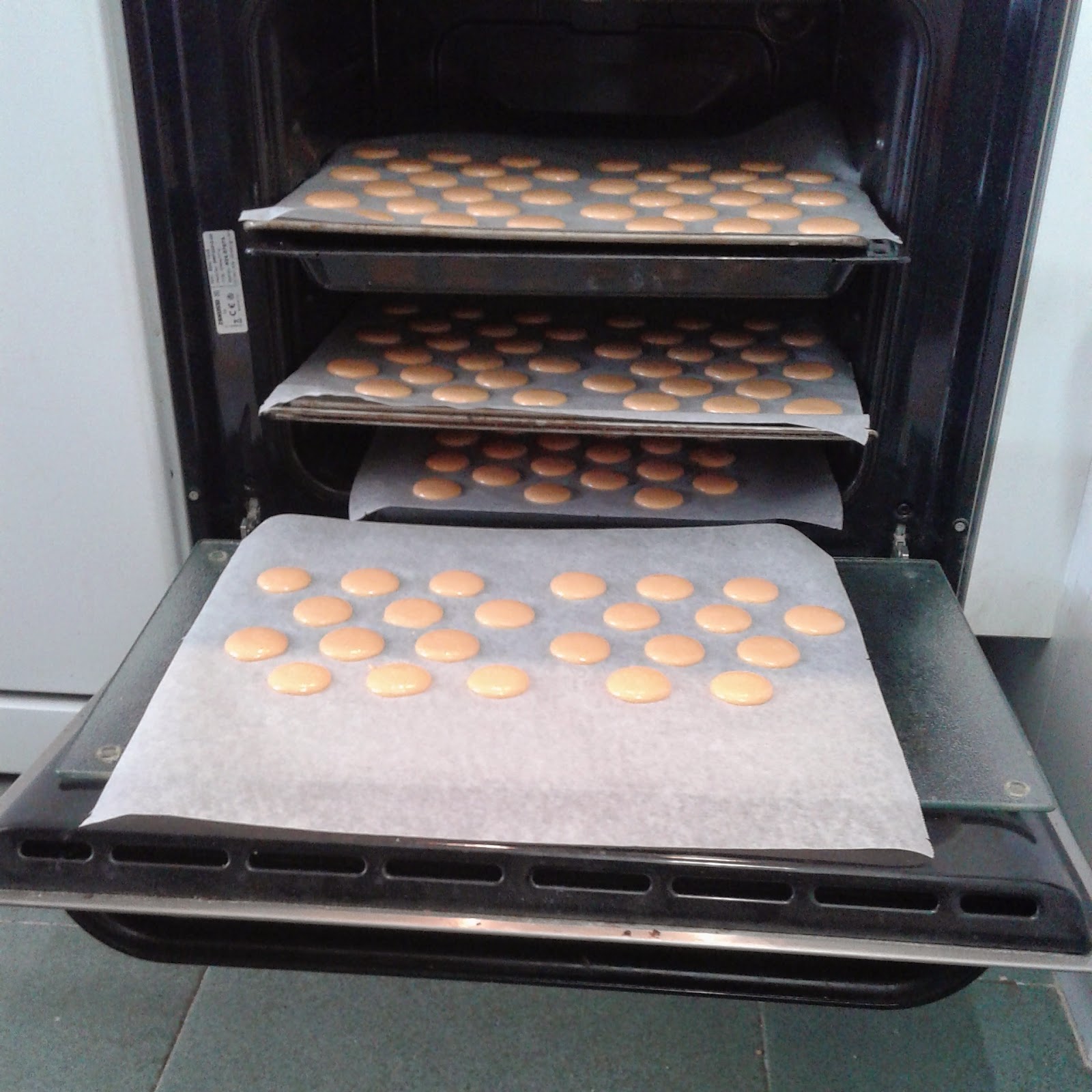 En mi caso la primera hornada quebró la mitad por la parte más cercana al horno, imagino que porque habría un contraste de temperaturas dentro del horno, así que asegúrate de que la temperatura está bien equilibrada; la segunda hornada preferí bajar la temperatura y aumentar el tiempo para que los macarons no se abrieran, pero cuidado con esto porque corres el riesgo de que queden duros o que pardeen. Una vez más, la experiencia te dirá cómo actuar.