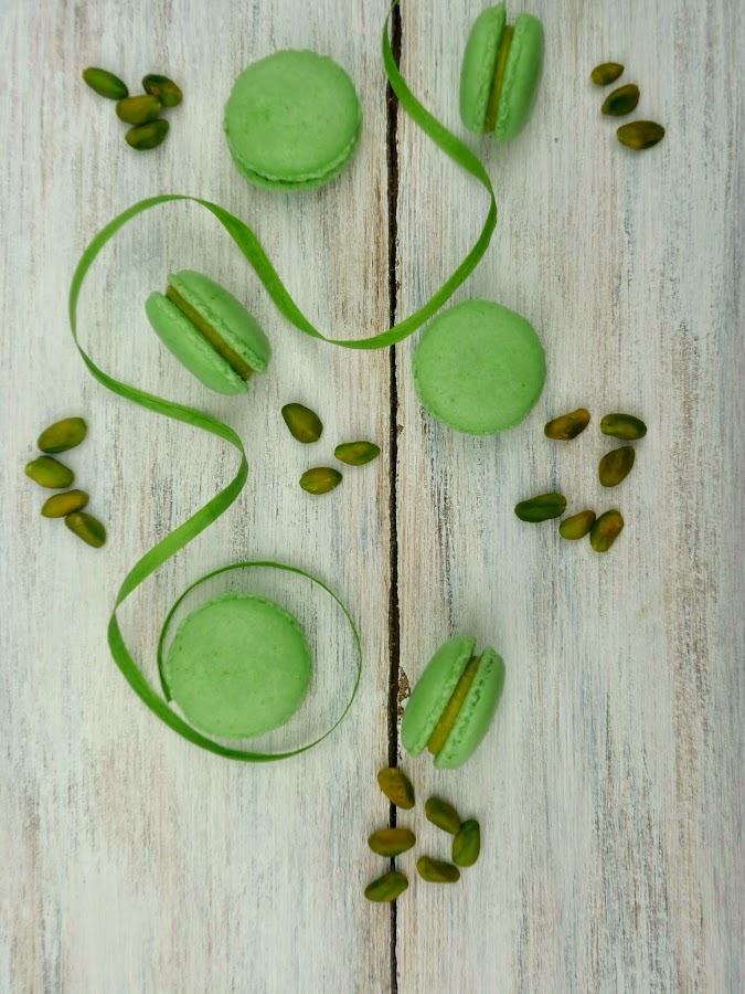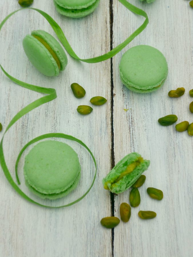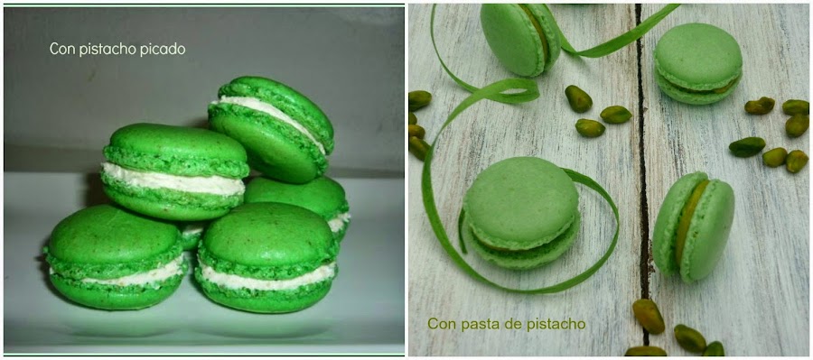 La primera vez que los hice de pistacho fue al comienzo de mi etapa macaronil, hace ya dos años. Una única foto tengo de ellos y no llegué a publicarlos. Os la enseño ahora, más vale tarde que nunca, aunque la crema es un poco diferente, porque en aquella ocasión no usé pasta de pistacho, sino el pistacho picadito bien menudo por en medio de la crema, lo que no da color y el sabor no es tan pronunciado.