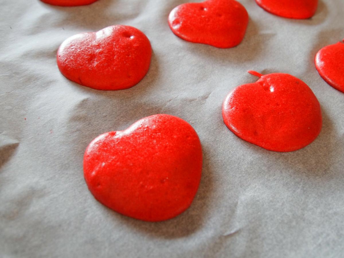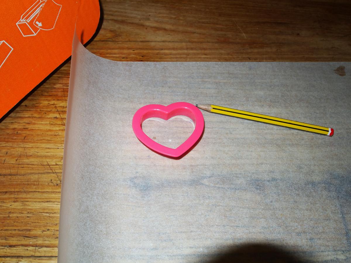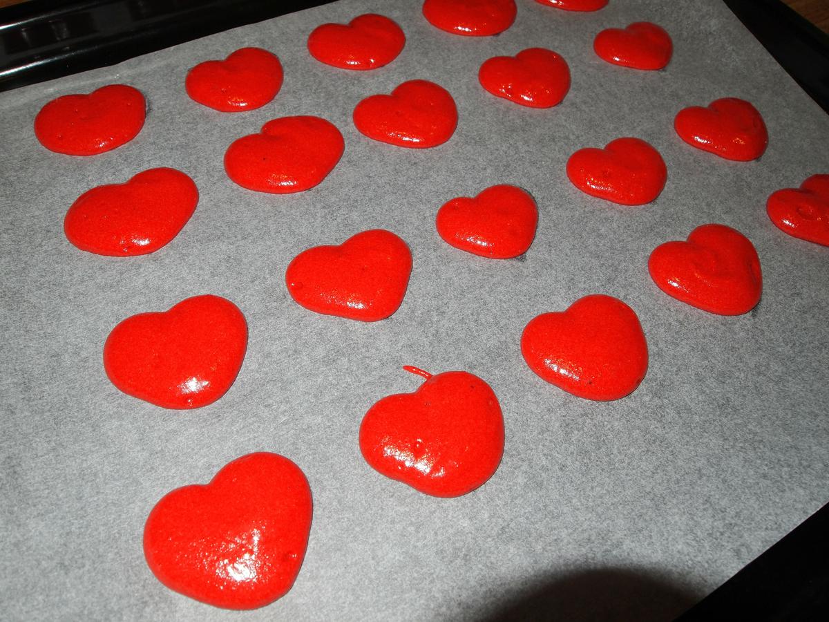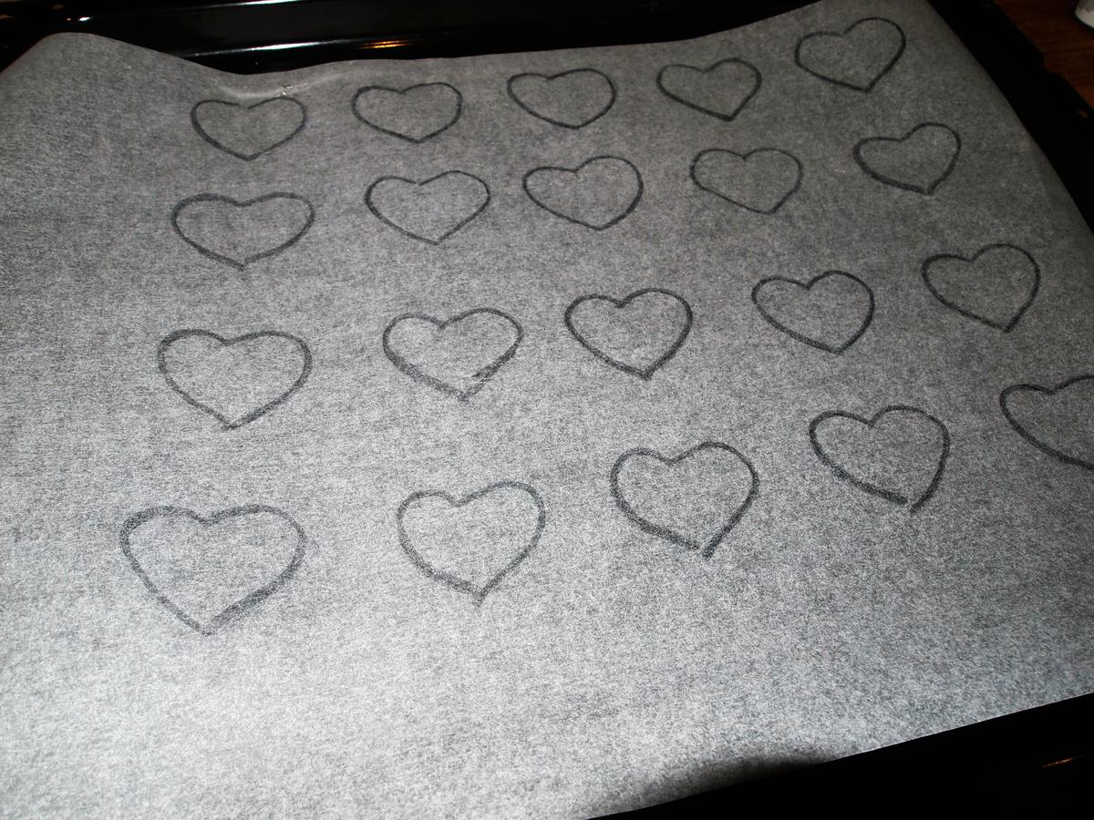 Hora de preparar el tapete. Los venden ya hechos, pero si no os vais a dedicar a la venta ambulante de macarons, os aconsejo que os fabriquéis vuestro propio tapete. Basta con pintar sobre papel vegetal para hornear corazones en este caso, o círculos en los normales, del mimos tamaño, con la ayuda de un cortador de galletas. Los pinte primero con lápiz y repase luego con rotulador para que se vieran al darle la vuelta al papel vegetal. Puede parecer que es fácil de hacer sin la guía pintada, pero si queréis unos macarons de más o menos el mismo tamaño, os aconsejo no saltaros este paso.