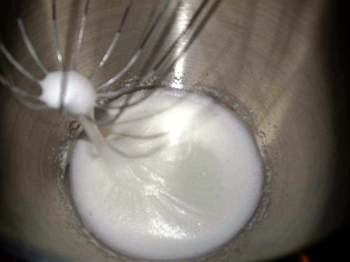 Una vez que tenemos las claras a temperatura ambiente, toca montarlas. Para ello lo mejor es un robot de cocina con varillas, muy limpito y con un pellizco de sal. Y darle caña hasta que empiece a espumar, en este punto añadimos los 50 gr de azúcar normal y la esencia y colorante. A seguir batiendo hasta que salgan picos firmes y tengamos el merengue en su punto. Ya sabéis el truco definitivo para saber si están, es darle la vuelta al cuenco y si no se caen, está listo, sino toca lavarse la cabeza y empezar de nuevo.