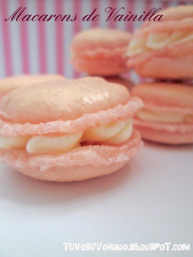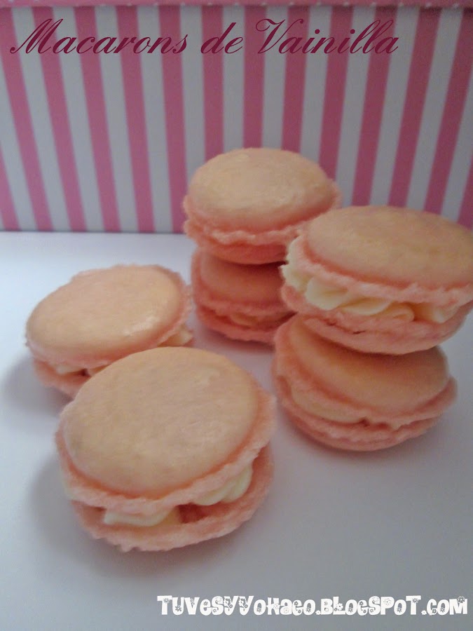 Los he preparado tres veces: la primera vez fue un desastre absoluto, no se si fue la receta que utilicé, que no me salió bien el merengue, que no tamicé bien la almendra molida y el azúcar glas; la segunda salieron un poquito mejor y los rellené de ganaché de chocolate y éstos que son los terceros y los últimos que he hecho, los he preparado con un relleno de vainilla.