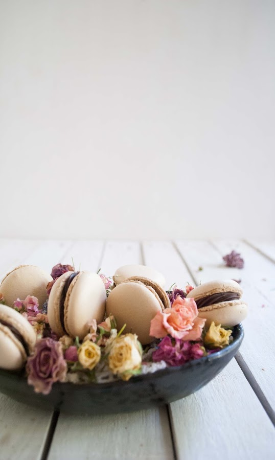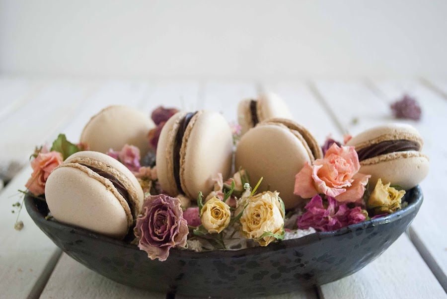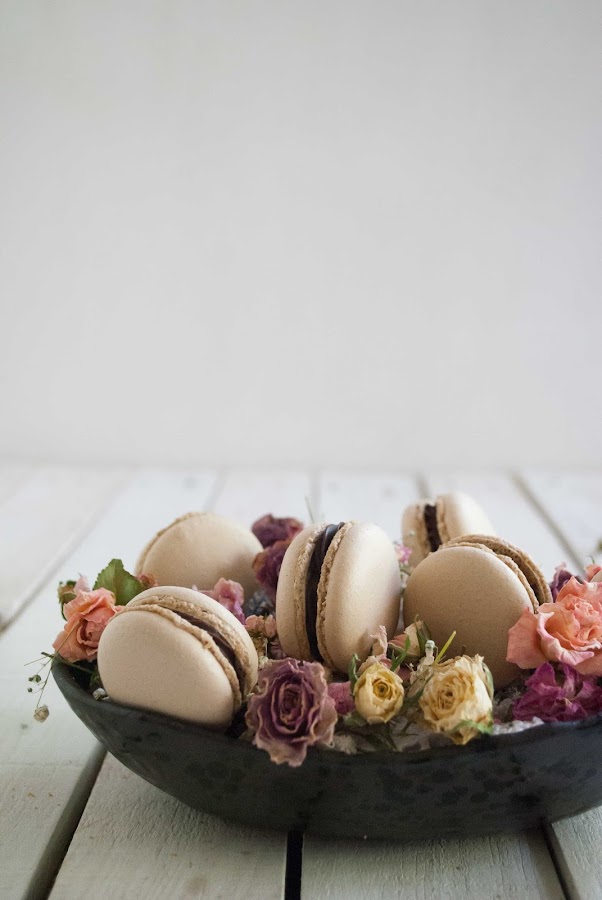 Son unos macarons de café rellenos de ganache de chocolate, la combinación no puede ser más perfecta, el café potencia maravillosamente el sabor del chocolate y juntos son una delicia.