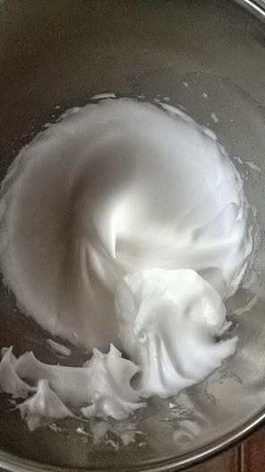 Comienza haciendo el merengue. Pon tus claras en el bowl donde vas a batirlas. Tiene que estar seco y limpio. Comienza a batir las claras hasta que estén a nieve, es decir, formen copos.. como en la foto. Mi batidora tiene 4 velocidades, yo la dejo en velocidad 3 durante 10 minutos.