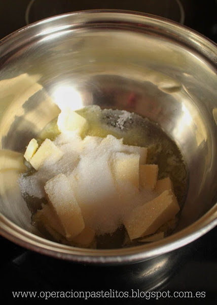 3. En otro cazo, ponemos la mantequilla junto con el azúcar y los llevamos a fuego medio.