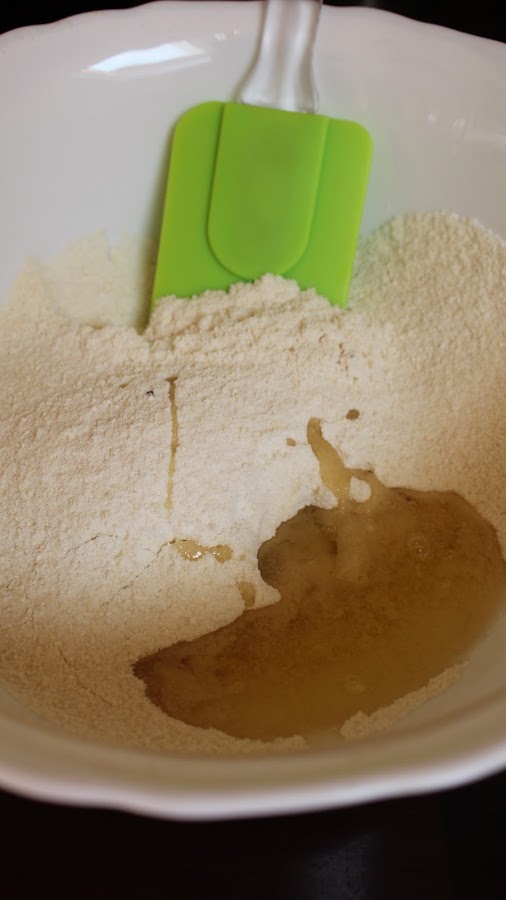 3. Agregamos los 28 g de claras de huevo envejecidas (eso quiere decir que separamos las claras de las yemas y las conservamos en la nevera tapadas durante 3 días). El día que queremos hacer nuestros macarons, sacamos las claras viejas de la nevera y las dejamos a temperatura ambiente antes de utilizarlas, y removemos con una espátula hasta conseguir una masa de este aspecto: