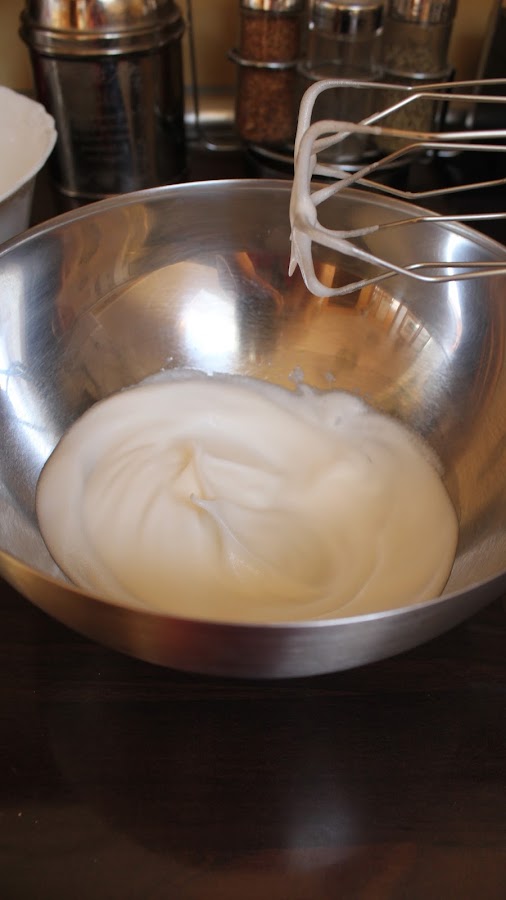 3. Cuando llegue el almíbar a la temperatura adecuada (118°C), lo echamos sobre las claras montadas en un hilo finito mientras batimos sin parar con las varillas eléctricas. Conseguiremos un merengue brillante y con picos. Seguimos batiendo hasta que se baje la temperatura del merengue.