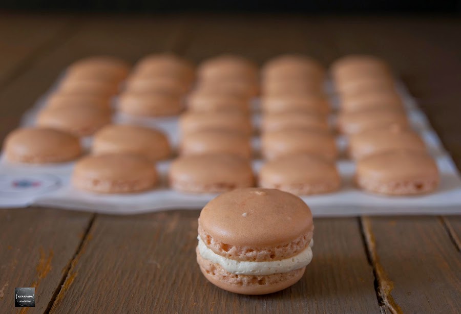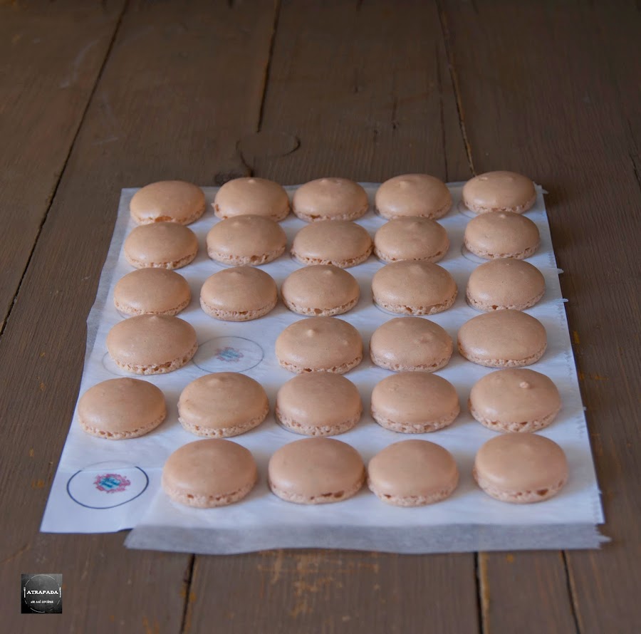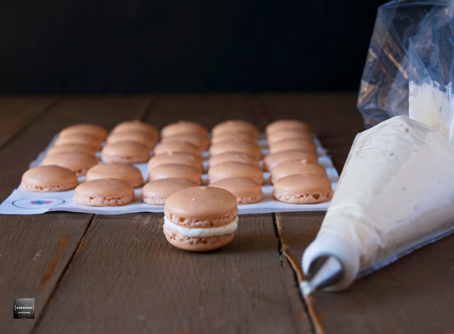 Mezclamos con una espátula, con movimientos envolventes de abajo a arriba, sin pasarnos de movimientos para no volver la mezcla muy líquida, así que, en cuanto veamos que se ha integrado todo, dejaremos de remover. Ponemos la mezcla en una manga pastelera con una boquilla lisa. A mi sigue sin darme buen resultado la alfombra de silicona para hornear macarons (aunque Lolah sí que las usa con esta receta y le salen perfectos). Yo imprimí una plantilla para macarons de esta página , puse una hoja de papel vegetal sobre ella la recorté a medida y sujeté con clips para que no se moviera. Usé dos plantillas y el resto los puse en la alfombra de silicona. Rellenamos los huecos sin llegar a hacerlo completamente, poniendo la manga totalmente recta. Damos unos golpecitos a las bandejas sobre la mesa. Esperamos a que se sequen completamente (es sólo esperar, no seáis impacientes, puesto que es un paso fundamental). Y lo habrán hecho cuando toquemos con el dedo y nos manchemos nada. Los del tapete de silicona tardaron más en secarse, por lo que fueron los últimos en hornearse. Los míos tardaron poco más de una hora en secarse. Otro paso fundamental es el horneado, después de llegar hasta aquí no debemos estropearlo todo con el horneado. Horneamos a 145º, yo necesité unos 18 minutos, aunque Lola los tuvo menos tiempo, ésto es cuestión del horno. Sacaremos cuando comprobemos que se despegan bien. Dejamos enfriar totalmente.