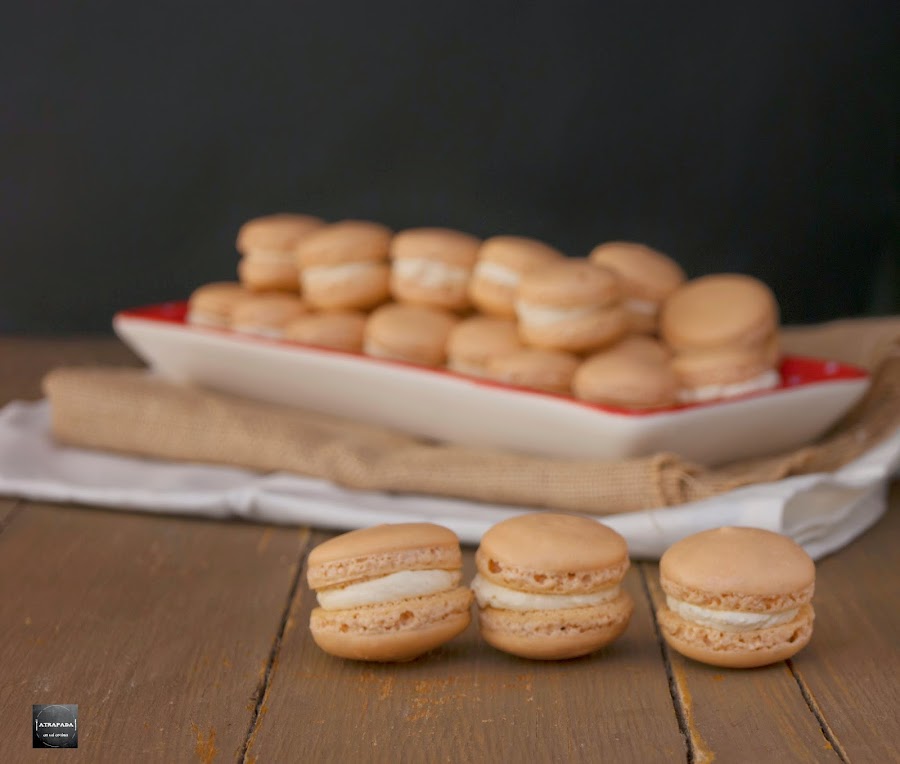 Cuando estén fríos prepararemos el relleno. Ponemos todos los ingredientes en el bol de la batidora y batimos primero a poca velocidad (yo lo he hecho con la pala de la Kitchen Aid) tapando el bol para que no salga por los aires el azúcar glass. Después batimos cuatro o cinco minutos. Introducimos el buttercream en una manga pastelera y rellenamos los macarons poniendo la mezcla sobre una mitad y tapando con la otra.