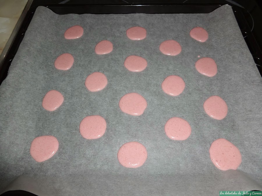 Vertemos el contenido de la masa en una manga pastelera y vamos rellenando los círculos, pero sin llenarlo por completo, ya que después se expanden un poco. Quitaremos con cuidado la platilla de debajo una vez que tengamos todos los círculos llenos.