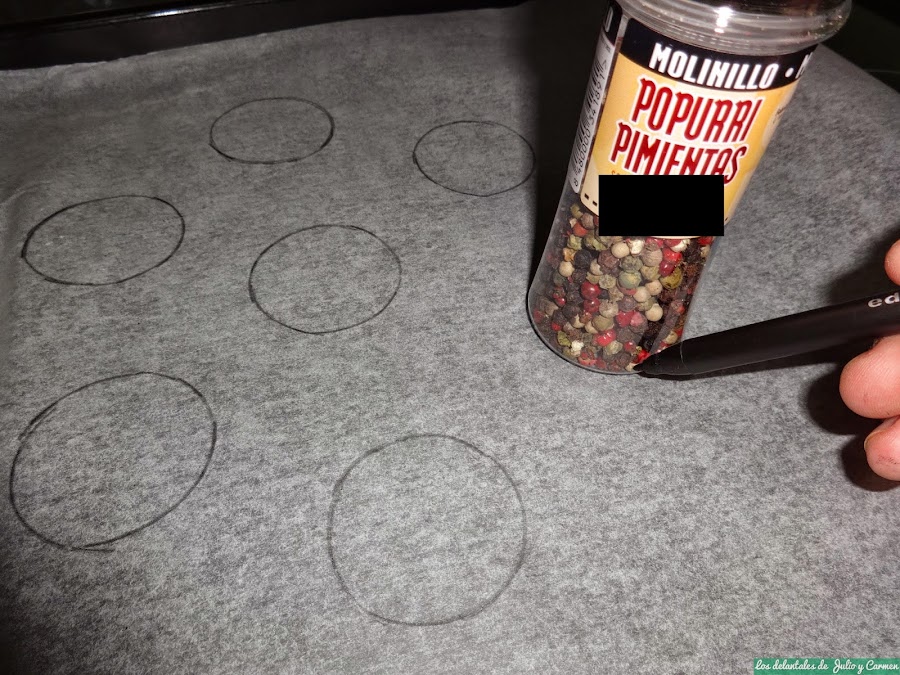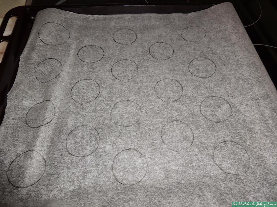 Lo primero que haremos sera preparar una especie de plantilla que nos servirá después para que todos los macarons sean mas o menos del mismo tamaño: en papel vegetal, pintaremos círculos de unos 3 - 4 cm. La dejaremos preparada para usar después.