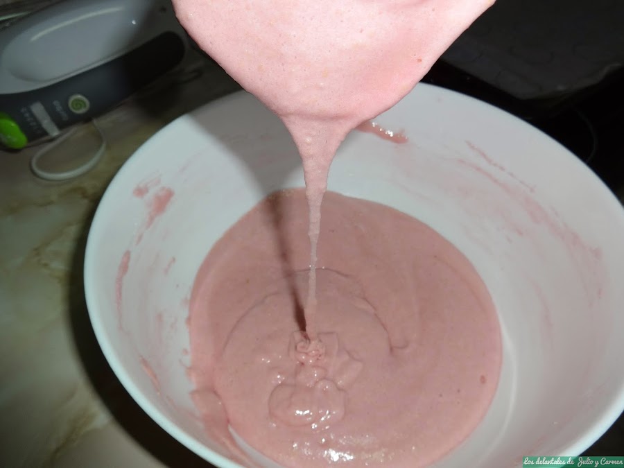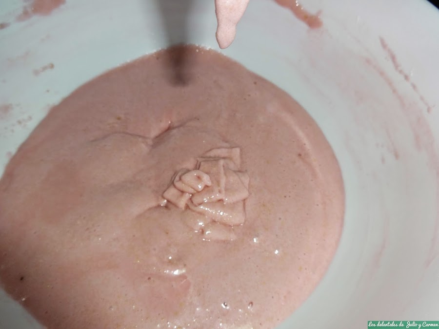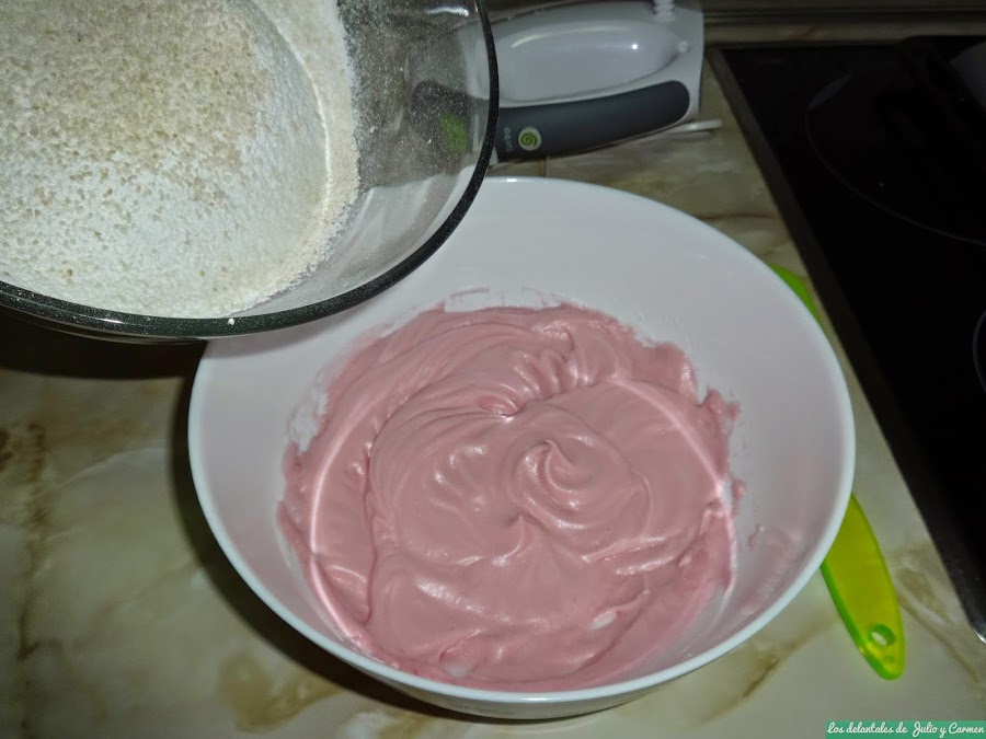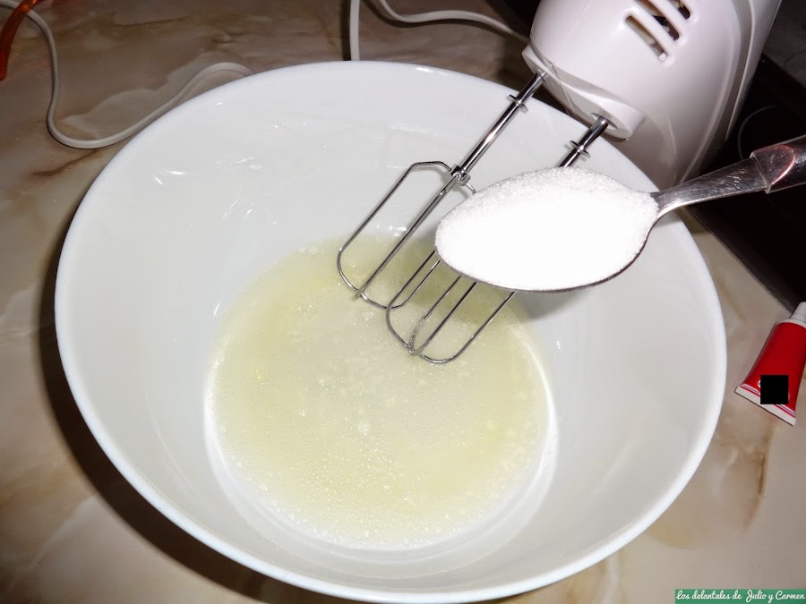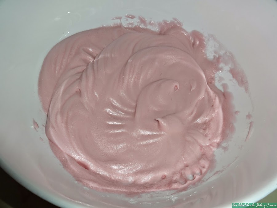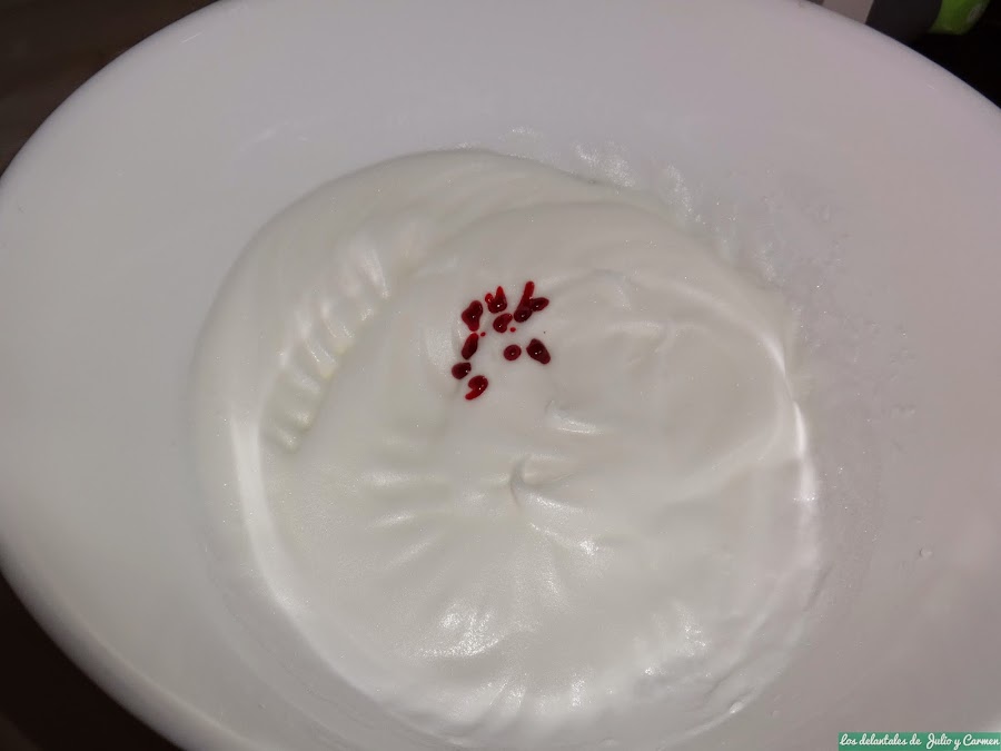 Batimos las claras. Cuando comience a salir pompas (como cuando nos lavamos las manos), echaremos el azúcar y continuamos batiendo hasta punto de nieve. En ese momento, echaremos el colorante y lo removemos bien para que quede el color bien distribuido.