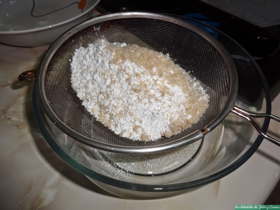 Ahora, uniremos el azúcar glas con la almendra molida y lo tamizamos un par de veces, para que nos quede una mezcla muy muy finita.
