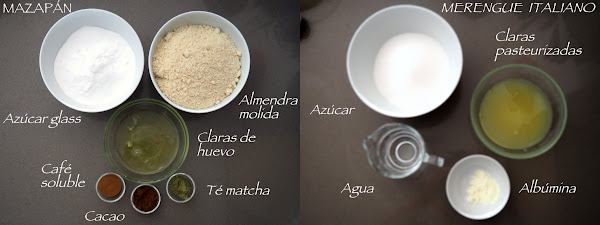 Batir ligeramente las claras y dividirlas en tres boles. Añadir en cada uno los diferentes ingredientes de sabor, té matcha, chocolate y café. Batir hasta conseguir que se diluyan bien. Reservar.