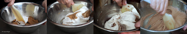 Incorporar su parte del merengue poco a poco, en dos o tres veces y mezclar con espátula de manera que se vayan integrando todos los elementos, hasta conseguir una masa brillante con una textura de "cinta".