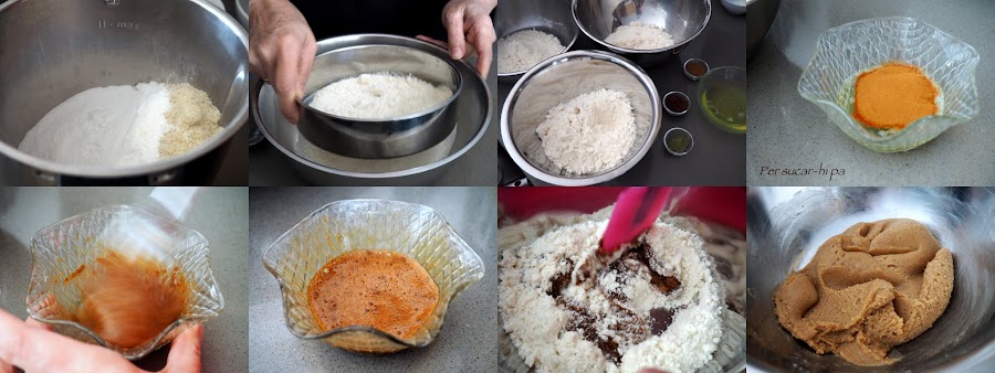 Tamizar al mezcla sobre un bol y, en este caso al hacer tres sabores diferentes, dividimos en tres partes iguales y reservamos.