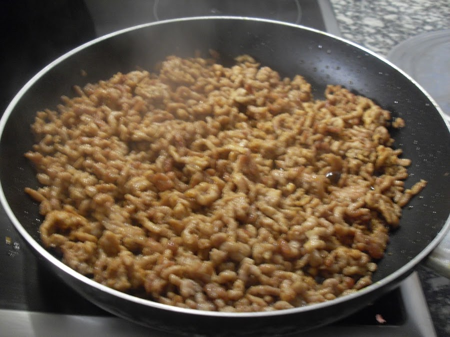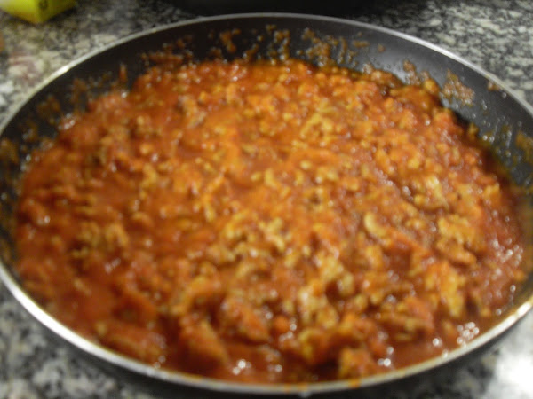 En una cazuela plana o sartén grande, sofreír la carne con el aceite, añadir a los pocos minutos las hortalizas. Cuando el sofrito haya cogido color, agregar el vino, dejar evaporar un par de minutos y añadir el tomate.