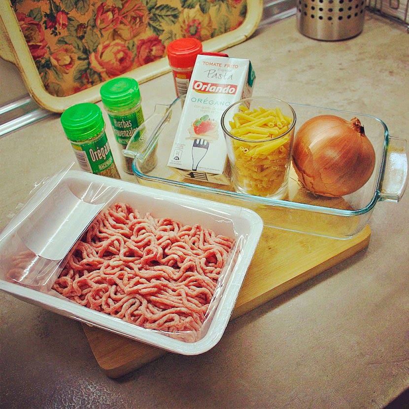 5. Echamos el brik de tomate frito a la sartén con la carne y la cebolla, especiamos a lo loco con orégano, albahaca y las hierbas y un poco de pimienta. Hacemos lo mismo en la olla hirviendo con los macarrones.