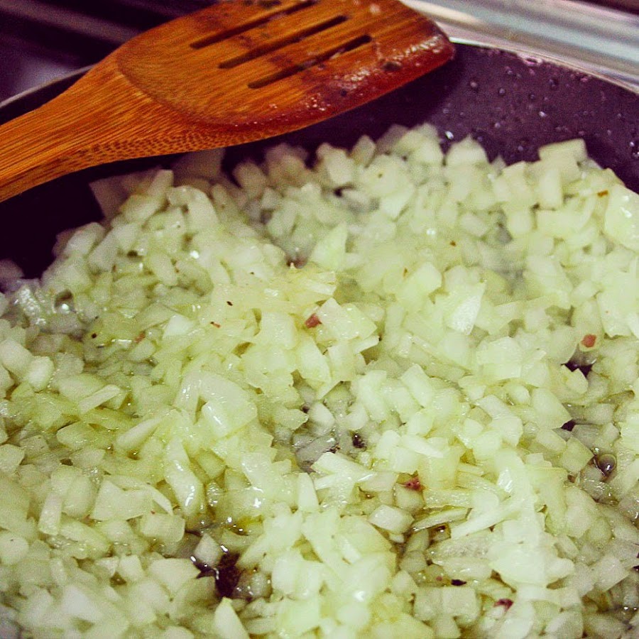 3. Mientras el agua hierve y la carne se va haciendo, troceamos la cebolla en trocitos muy pequeños y mezclamos en la sartén con la carne.