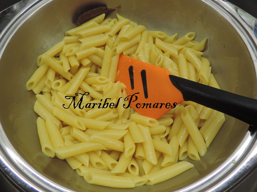 Ponemos los macarrones, agua, aceite oliva, sal, cúrcuma y laurel en la cubeta de la olla.
