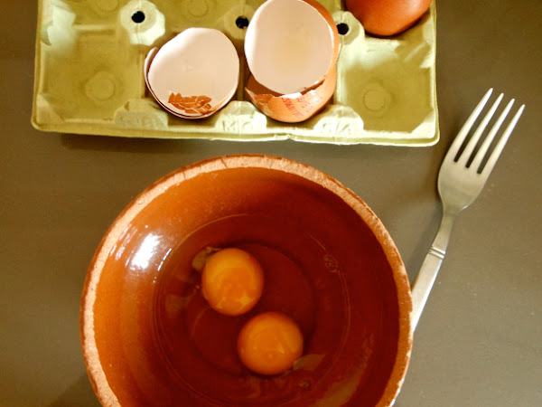 Mientras el bacon se dora, casca los huevos sobre un bol, añádeles dos pizcas de sal y bátelos.
