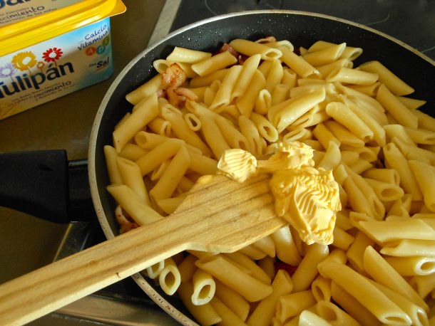 Una vez el bacon esté dorado, añade los macarrones y una cucharada de mantequilla.