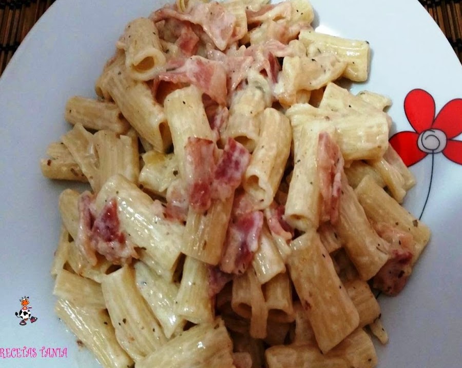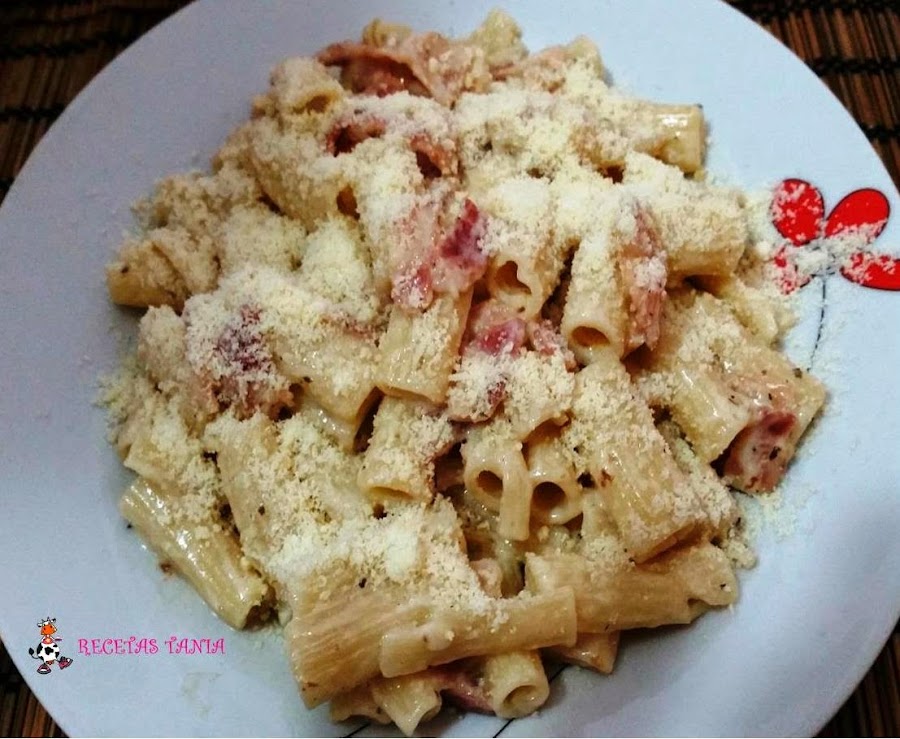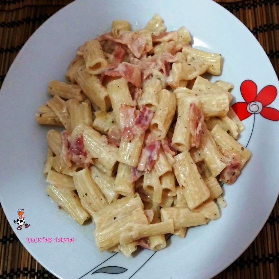 En un caldero ponemos agua y sal y lo ponemos a hervir para añadir los macarrones durante unos 7-8min. Preparamos la salsa,en una sarten ponemos un chorrito de aceite de oliva y añadimos la cebolla picadita, sofreímos y añadimos el bacon troceado en tiras y sofreímos con la cebolla cuando esté doradito añadimos un poco de pimienta molida y orégano,añadimos la nata (crema de leche),bajamos el fuego y removemos sin parar hasta que se mezcle todo y la nata (crema de leche) empiece a espesar. Escurrimos el agua de los macarrones y añadimos la salsa carbonara por encima,mezclamos bien y servimos. Podemos poner queso parmesano rallado por encima...