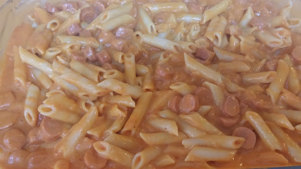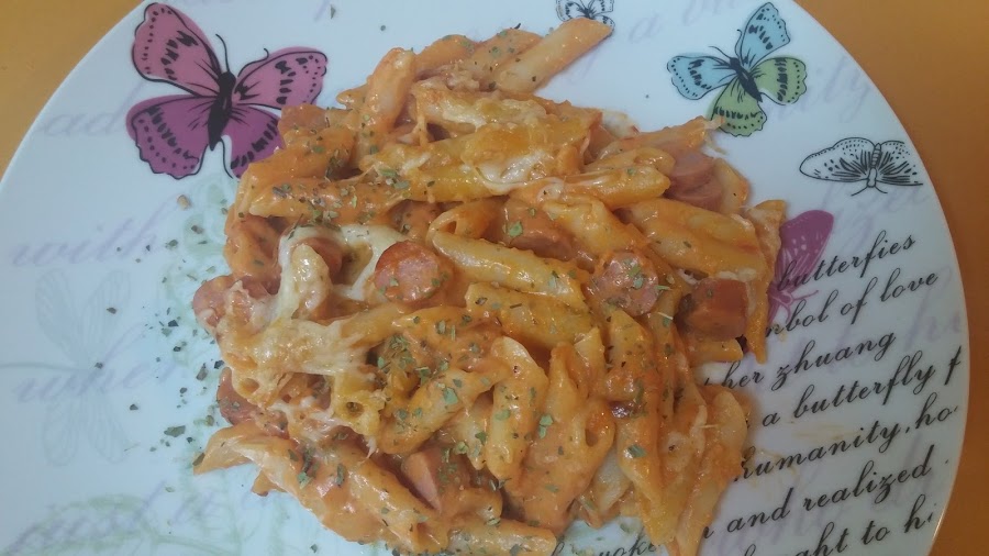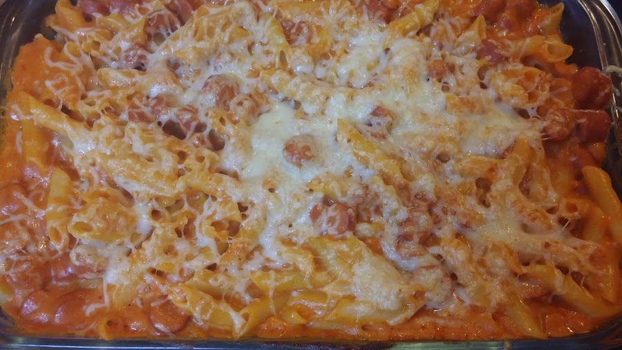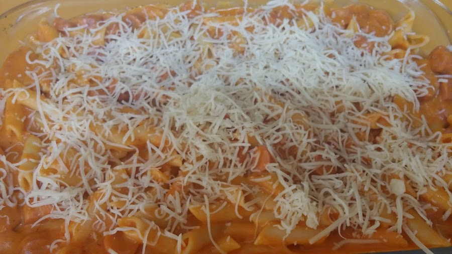 Ahora cogemos una fuente apta para horno y echamos los macarrones reservados. Por encima añadimos la salsa y mezclamos. Echamos queso al gusto por encima y al horno.