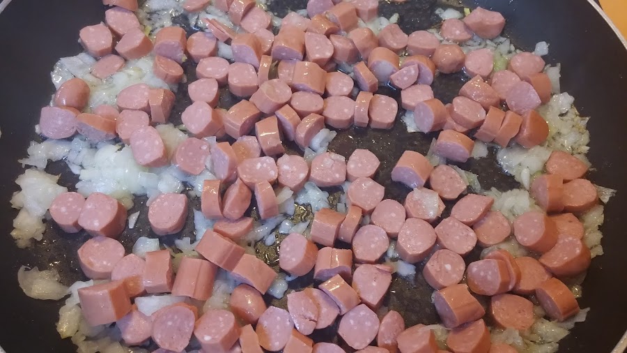 Cuando veamos que empieza a pocharse, añadimos las salchichas cortadas a rodajitas.