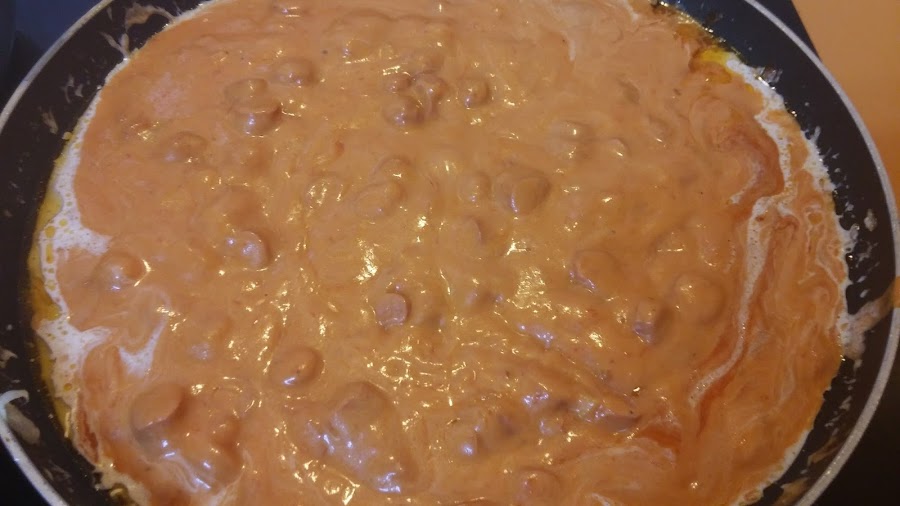 Salpimentamos y vamos a dejar que se frían unos minutos. Añadimos el tomate casero y la nata (crema de leche) y dejamos freír un poco más. Ponemos el horno a precalentar a 200 grados.