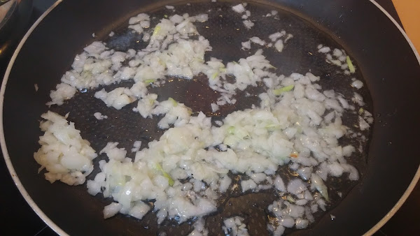Ponemos a cocer la pasta con agua abundante, sal y un poco de aceite. Reservamos una vez cocida. Mientras vamos a ir haciendo la salsa. Para ello, picamos bien la cebolla y la ponemos a freír en una sartén amplia.