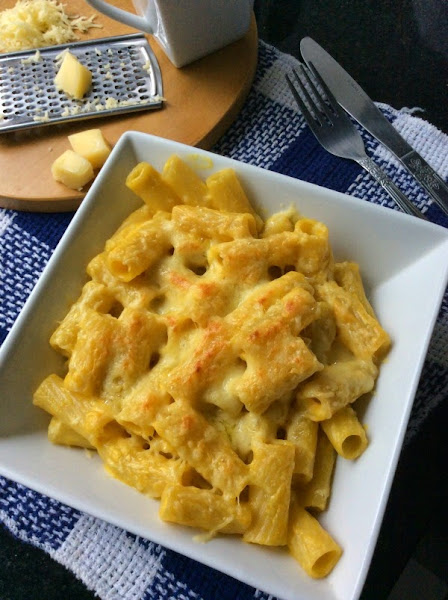 Place the macaroni in a ovenproof dish. Sprinkle the grated cheese and the olive oil on top.