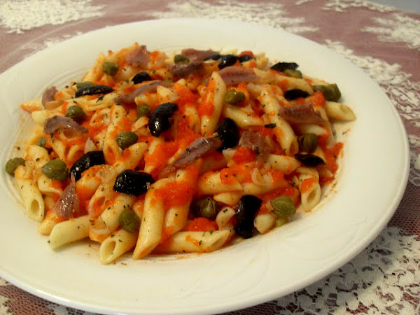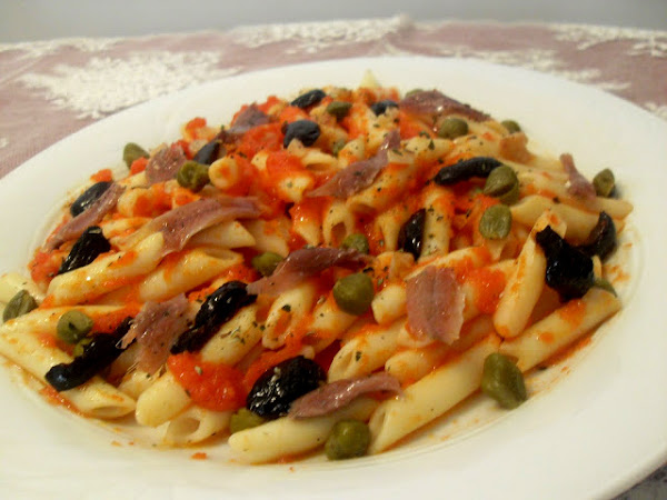 Poner una olla con 4 litros de agua a hervir y añadir una cucharada sopera de sal. Cuando hierva agregar la pasta y cocer al dente. Colar y reservar.Cuando la salsa empiece ha hervir, bajar el fuego y cocinar los tomates hasta que se hayan reducido y separado del aceite 20-40 minutos, agregar las alcaparras, el orégano o mejorana picados y las aceitunas cortadas, la pizca de guindilla y remover.