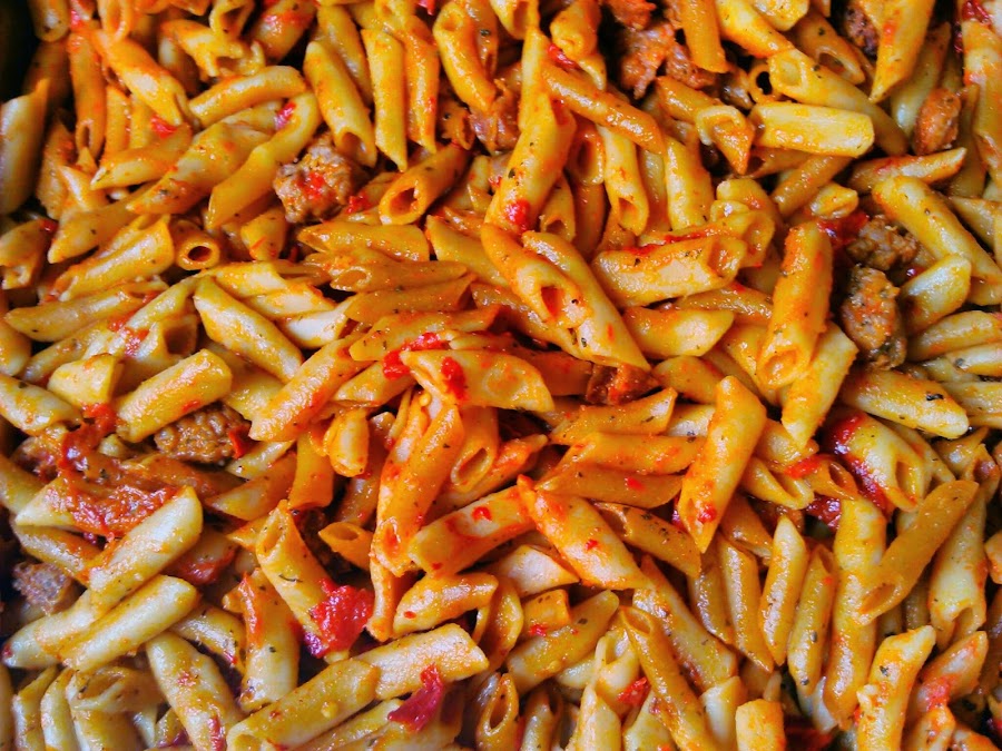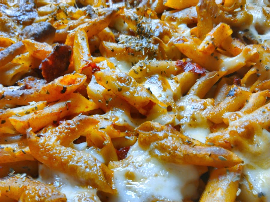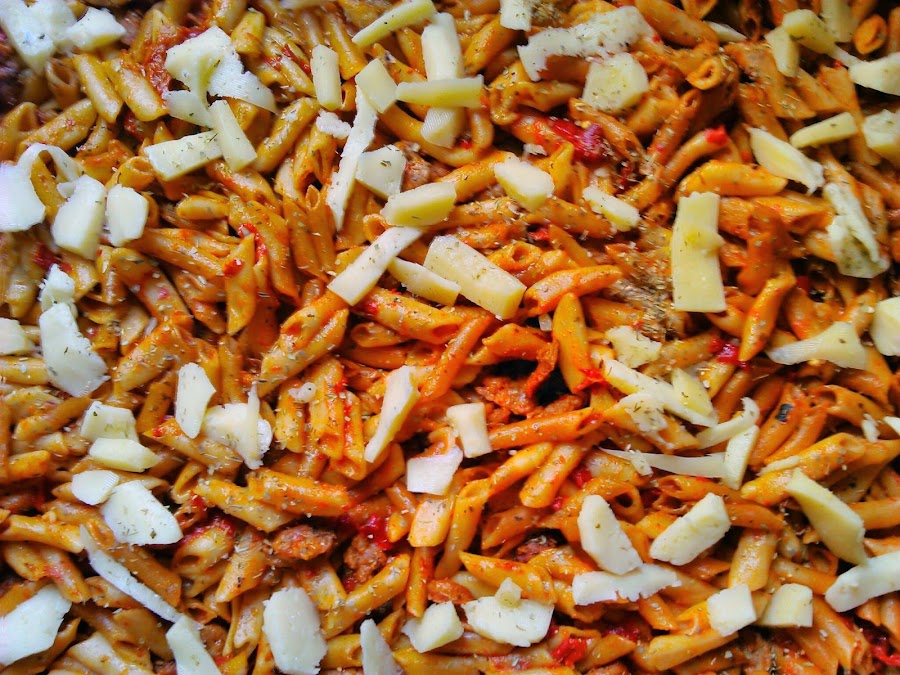 NUTRICIÓN: macarrones, tomate frito, embutido, queso, albahaca, orégano.