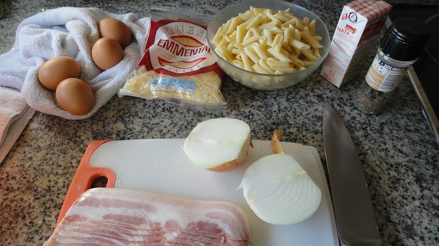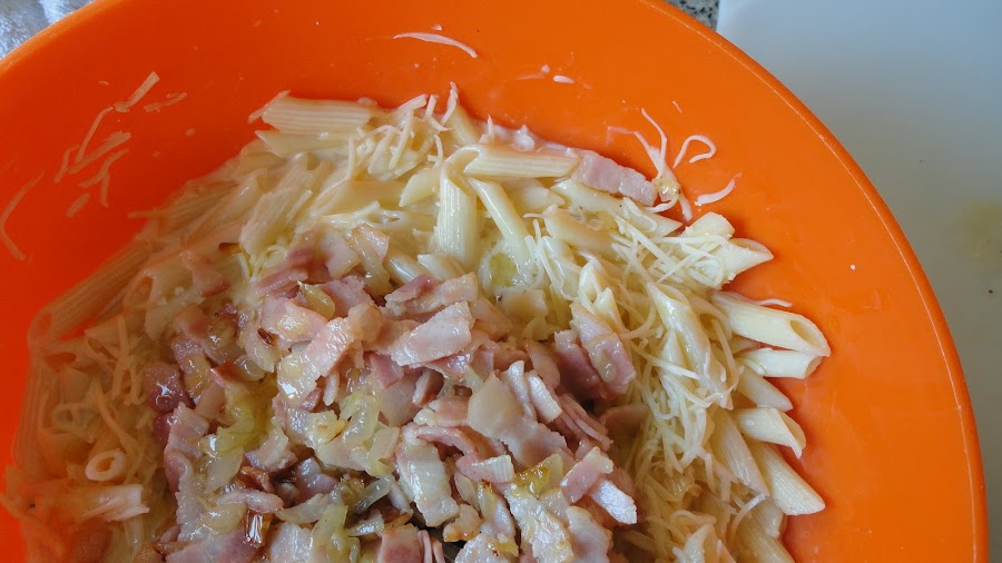 En un bol batimos los huevos, agregamos la pasta, el sofrito de cebolla y bacon, el brick de nata (crema de leche), casi todo el queso (dejamos un poco de queso para poner por encima unos minutos antes de sacar del horno) y salpimentamos.