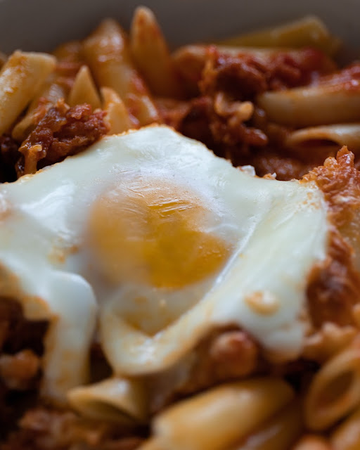 Puse los macarrones bajo el grill y cociné hasta que los huevos estuvieron hechos y el queso gratinado.