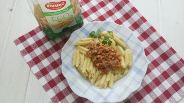 Hoy os traigo un plato que en casa es casi religión: la pasta boloñesa. En esta ocasión utilicé un paquete de Plumas Eco de Pastas Romero, que están elaboradas con trigo duro ecológico certificado por el Comité Aragonés de Agricultura Ecológica. La boloñesa española, o al menos, la boloñesa de mi casa, seguro que poco tiene que ver con ninguna salsa para pasta que provenga de Bolonia. Soy consciente de ello, por ello la he subtitulado {my way}.