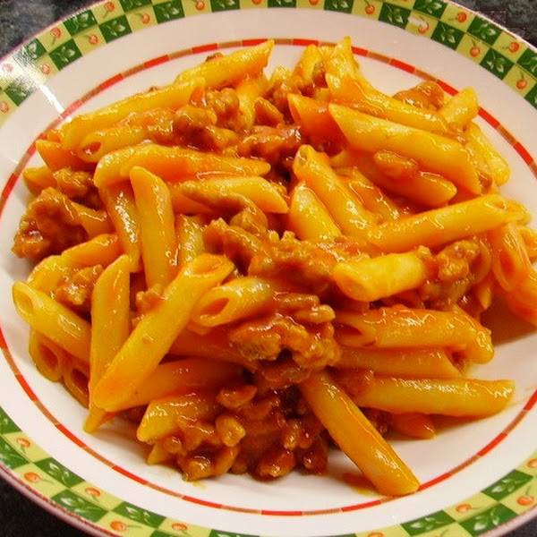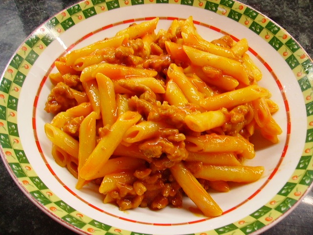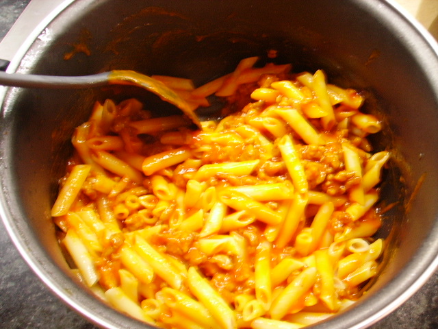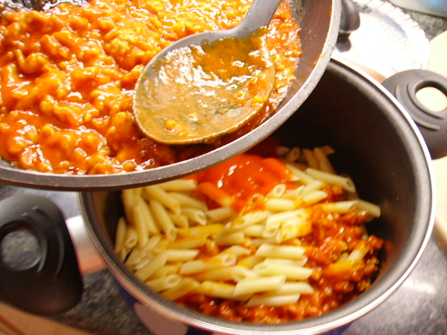7.- Mezclamos la salsa boloñesa con los macarrones.