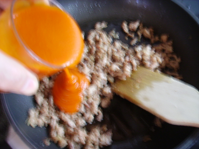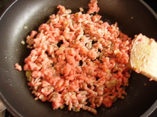 5.- Sumamos la carne picada a la cebolla y seguimos moreando la carne hasta que esté hecha.