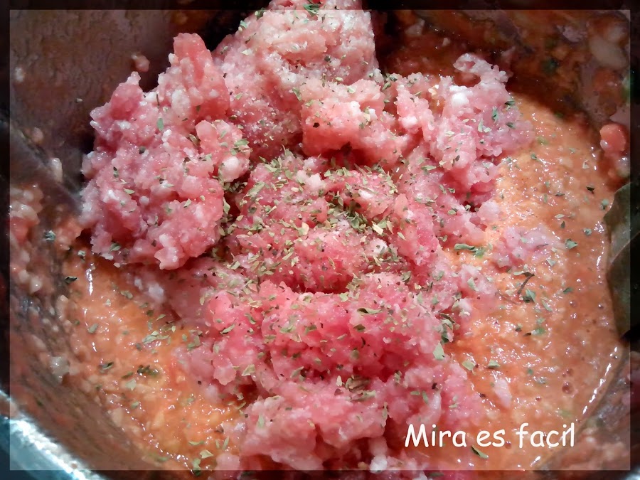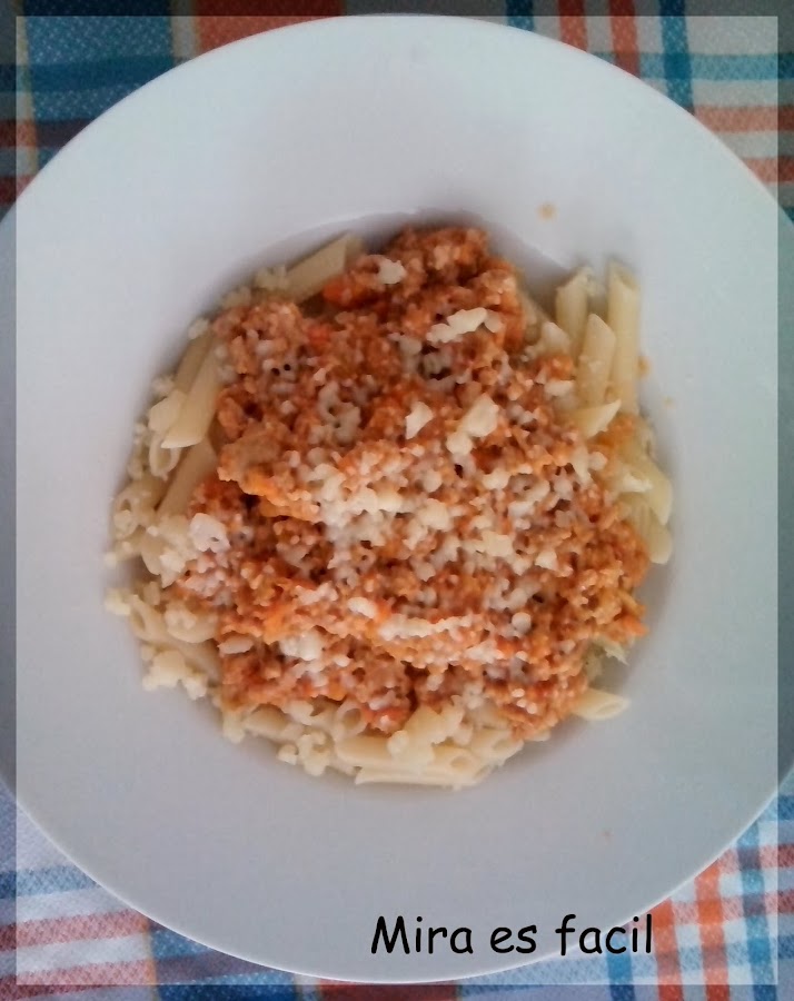 Ponemos la salsa sobre la pasta, y le añadimos el queso rayado.