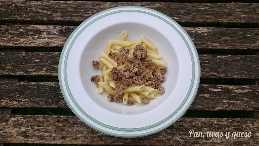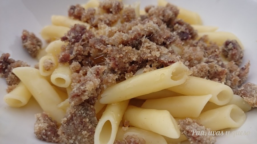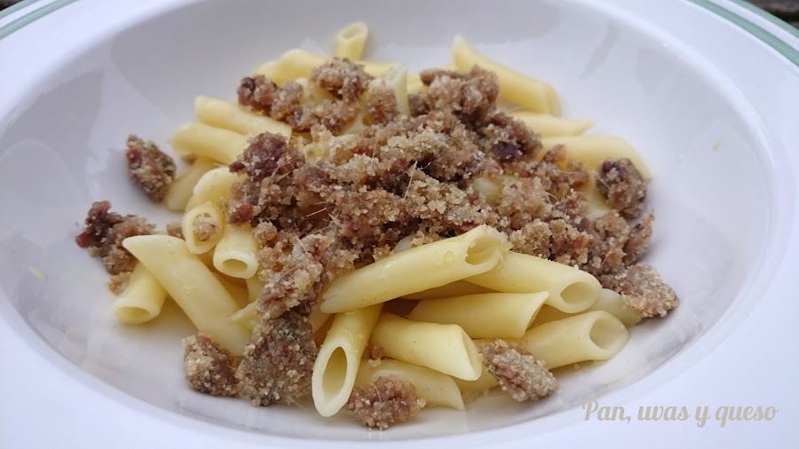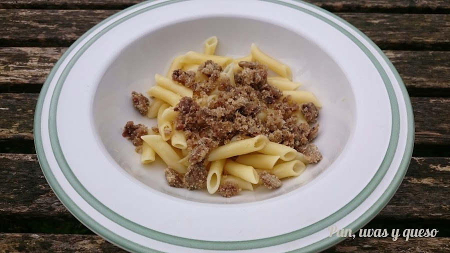 Servimos los macarrones en los platos y por encima colocamos la mezcla de anchoas y pan.
