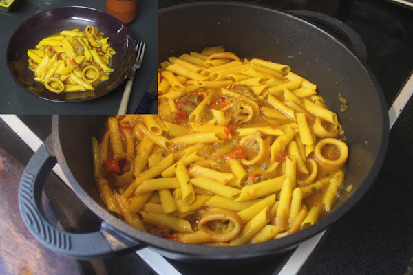 Aunque lo suyo habría sido prepararle un sofrito, como tenía congelados unos restos de sanfaina, opté por unirla a la pota, junto a unos macarrones.