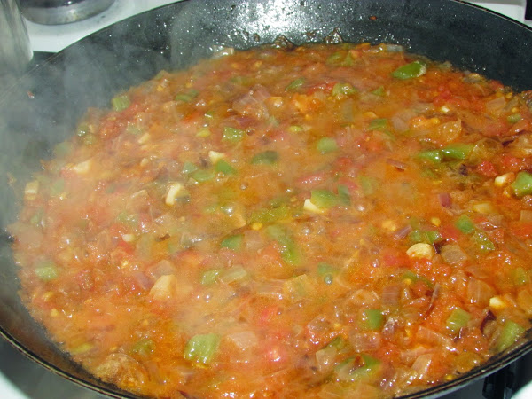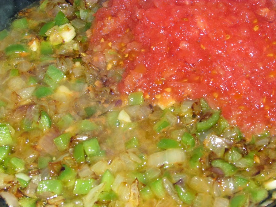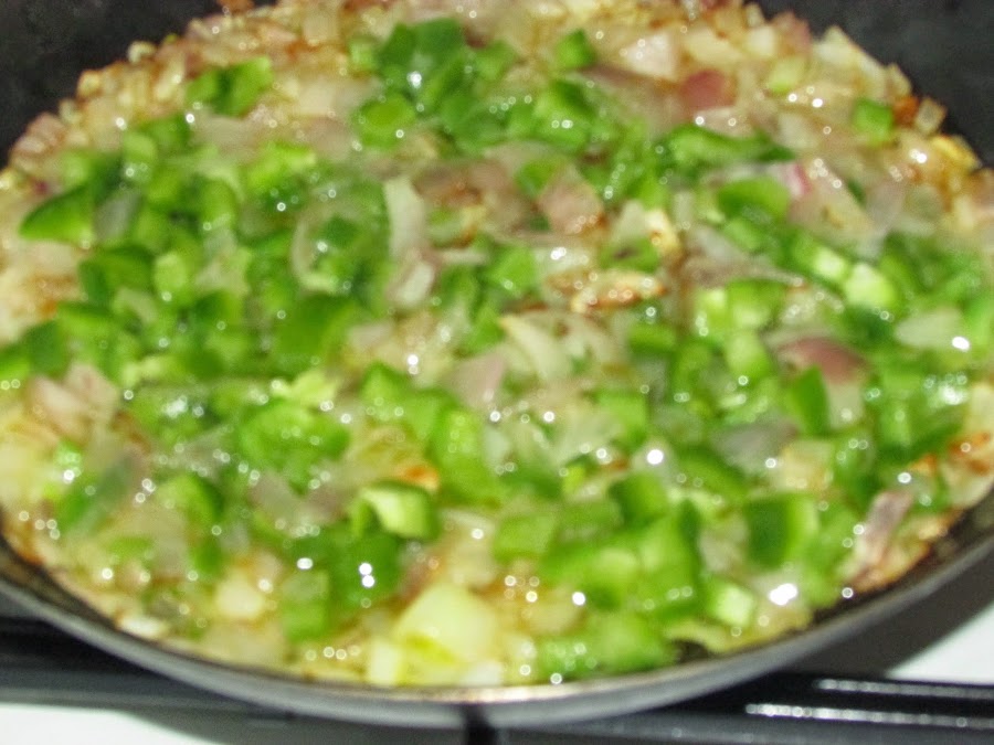 añade el pimiento verde picado, y espera a que esté bien sofrito,