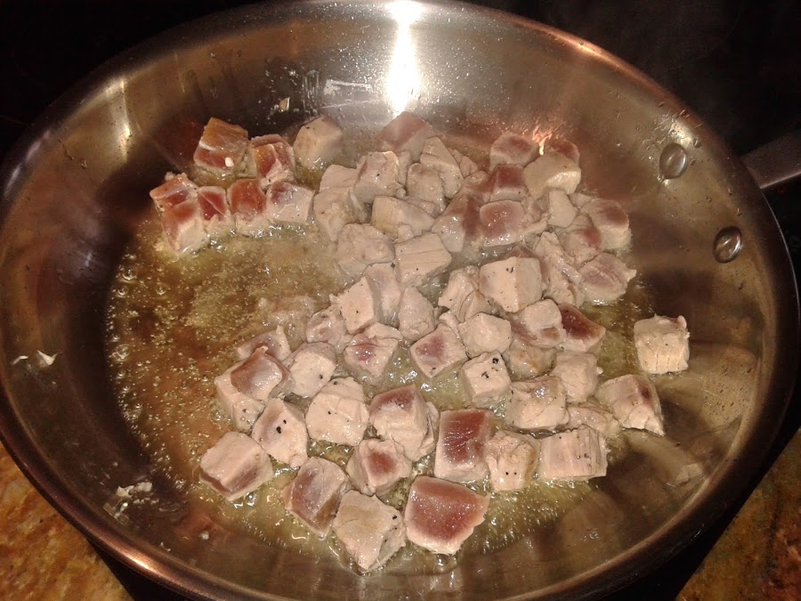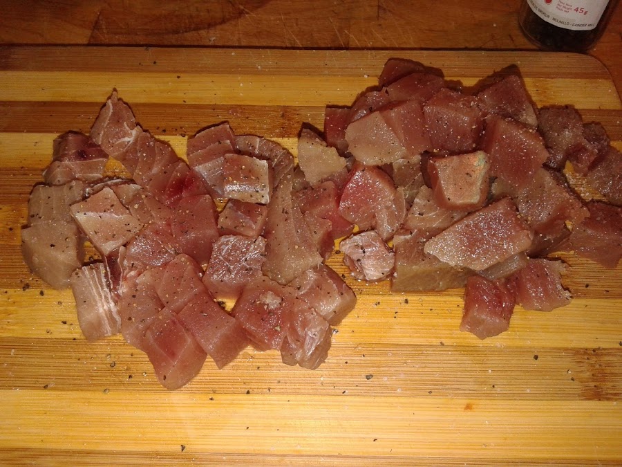 Empezamos cortando el atún en taquitos pequeños y salpimentándolo
