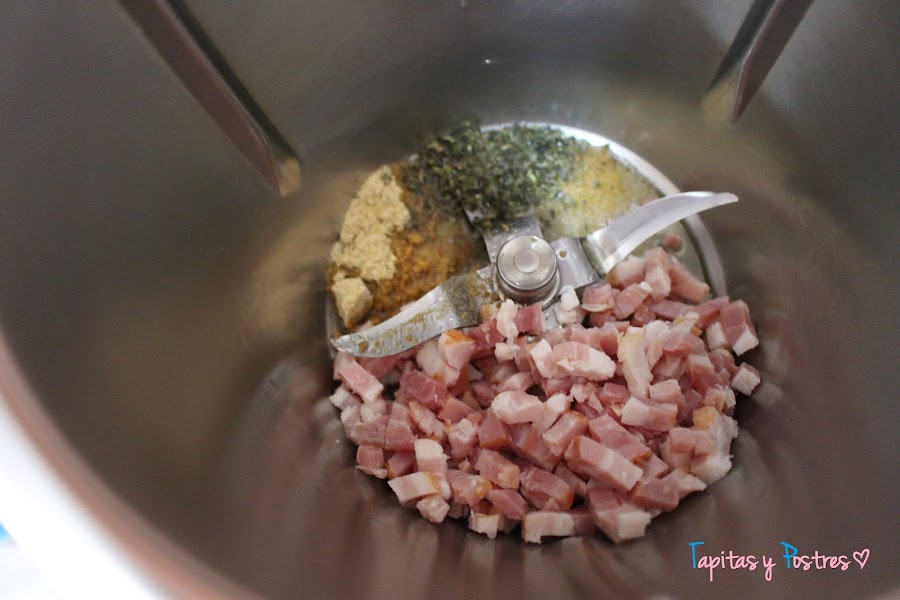 Ponemos en el vaso de la thermomix el aceite, pastilla de caldo, orégano, bacon...
