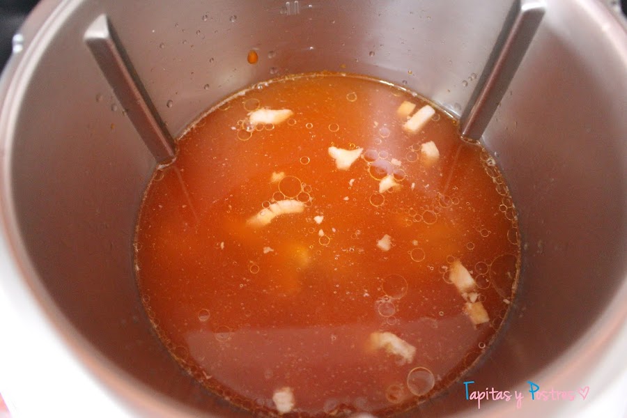 Ponemos en el vaso el aceite, la pastilla de caldo, el ajo en polvo, el orégano, el bacon en trocitos, los champiñones, el tomate frito y el agua. Programamos 7 minutos, 100º, giro inverso y velocidad cuchara.